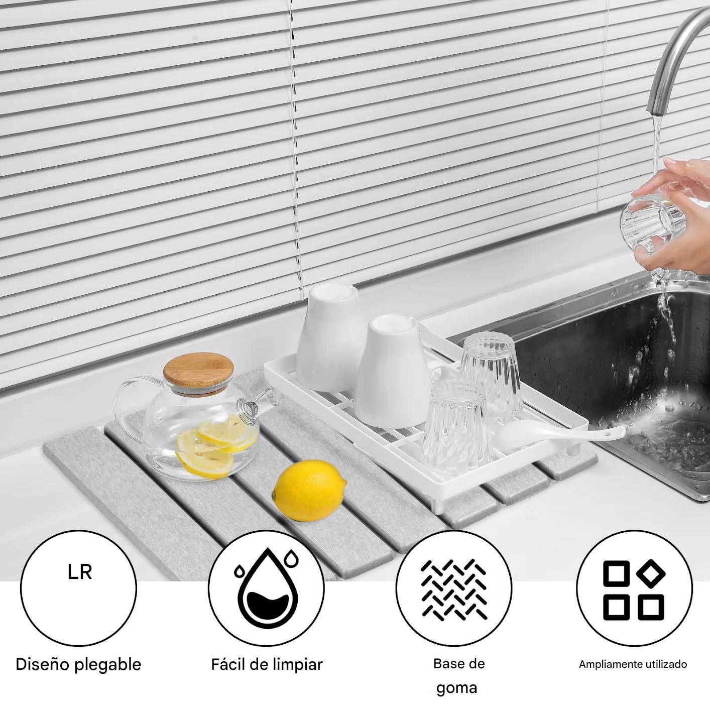 Mantén tus encimeras secas, ordenadas y libres de charcos con esta Alfombrilla de Secado de Piedra de Diatomeas de diseño plegable. Fabricada en diatomita + PVC, materiales que absorben rápidamente el agua y ayudan a mantener la superficie de tu cocina siempre limpia y lista para usar.