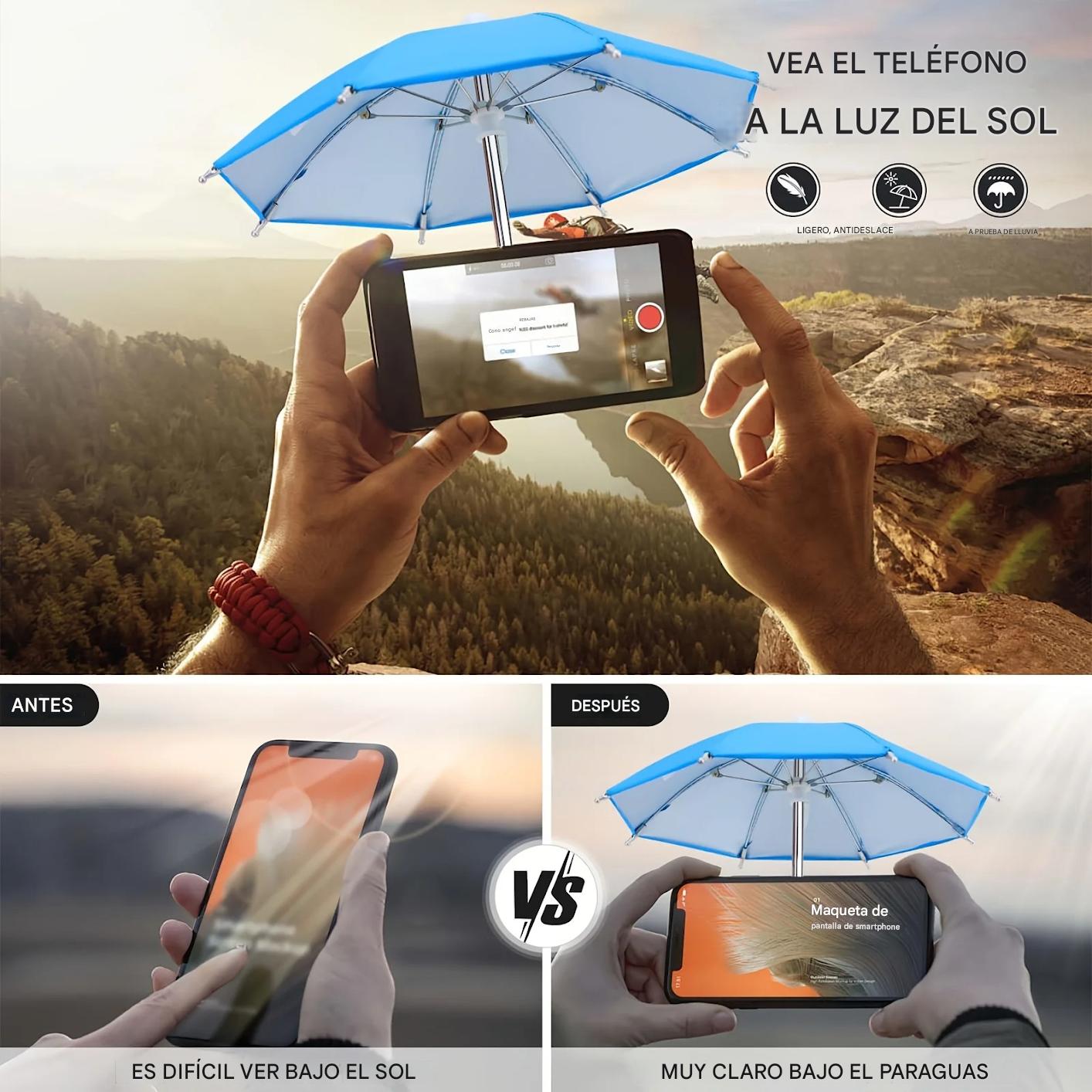 Protege tu smartphone del sol y mejora la visibilidad de tu pantalla en exteriores con esta mini sombrilla portátil. Ideal para días soleados en la playa, viajes en coche o uso al aire libre.