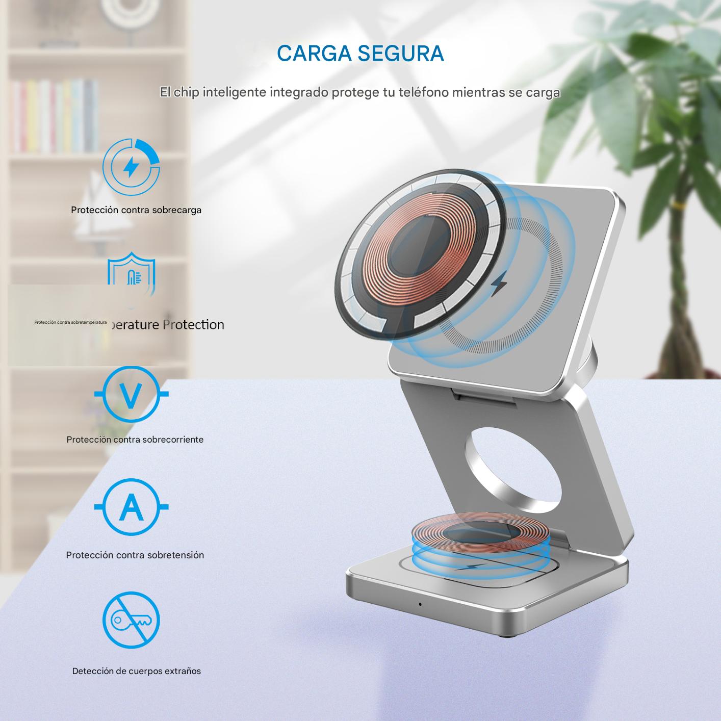 Diseño Magnético y Plegable: Ajuste seguro para iPhone + base estable para el reloj. Ahorra espacio.