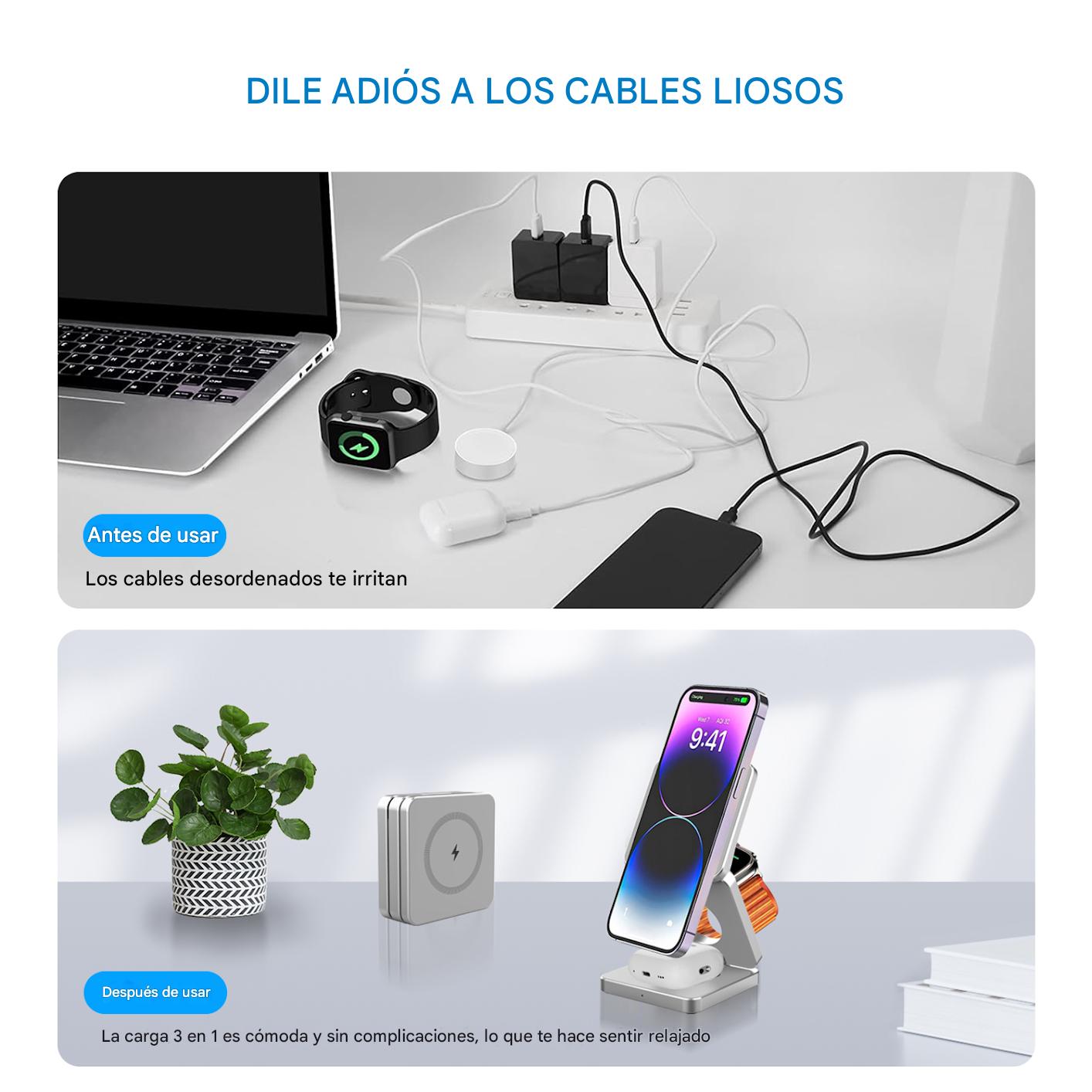 ¿Cansado de cables enredados? Carga tu iPhone, Apple Watch y AirPods al mismo tiempo con este cargador inalámbrico magnético 3 en 1. Diseño plegable compacto, carga rápida de 15W para iPhone y compatible con Apple Watch Series 9/Ultra y AirPods Pro 2. ¡Organiza tu espacio y carga todos tus dispositivos en un solo lugar!